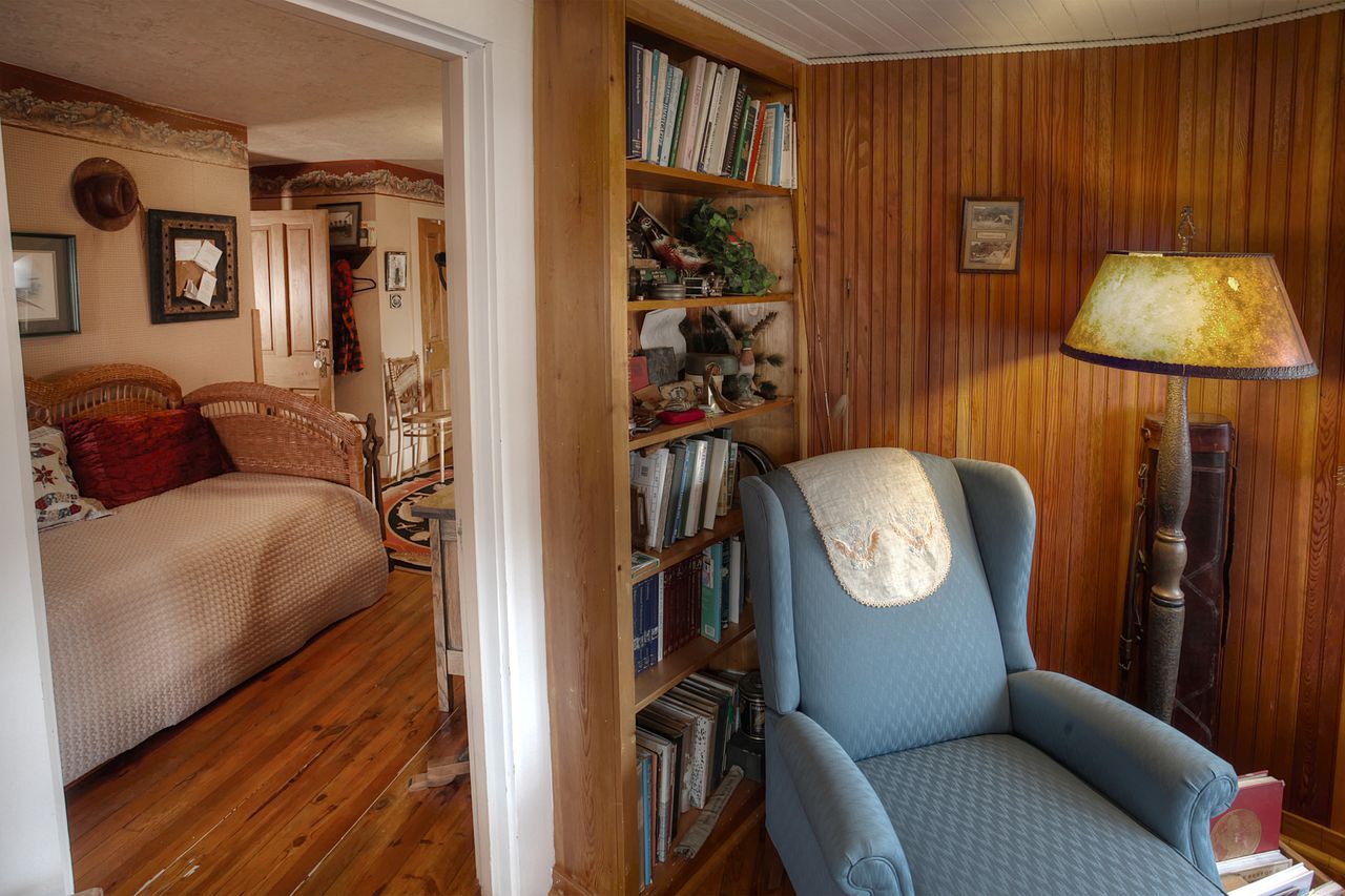 This two-room suite boasts a separate sitting area in the turret. It has its own cozy fireplace, complete with cushy chairs to unwind in. It is the perfect place to sit and read a book or enjoy a glass of wine or cup of hot cocoa. There is a library of nature and fly fishing books, many of which are signed by the authors (local heroes from Centre County). Hunting and fishing collectibles give this room a rustic look and feel and is an extra fun room for those fishing and nature enthusiasts.